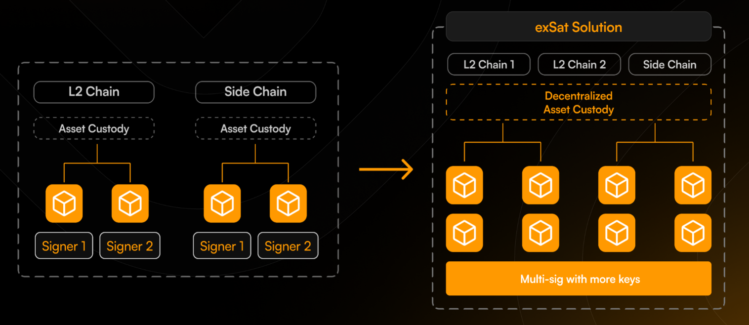 Decentralized asset custody is not a cross-chain bridge, but a decentralized service to help users or DApps hold and manage their assets on both Bitcoin and exSat. It's easy for DApps to build customized cross-chain bridge for customized assets, and more potentials can be discovered by using the decentralized asset custody service.