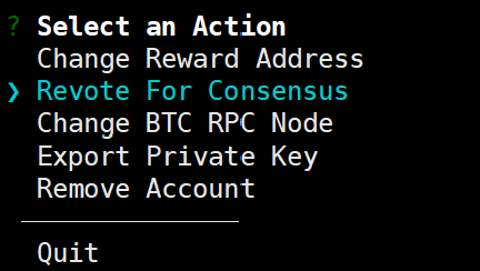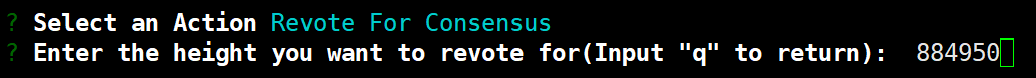 You can input the Bitcoin block height for which you want to initiate a re-vote and press Enter to submit the request. Once more than half of the Synchronizers submit a re-vote request for the same block height, the re-vote will be executed.